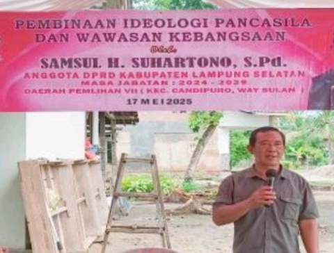 Angota Komisi I DPRD Kabupaten Lampung Selatan, Samsul H.Suhartono S.Pd.menyamoekam Dalam kegiatan sosialisasi tersebut bertujuan untuk meningkatkan pemahaman masyarakat tentang pentingnya ideologi Pancasila dan memperkuat wawasan kebangsaan, khususnya di kalangan generasi pemuda dalam menjaga keutuhan dan persatuan bangsa.